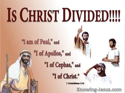 …My brothers, some from Chloe’s household have informed me that there are quarrels among you. What I mean is this: Individuals among you are saying, “I follow Paul,” “I follow Apollos,” “I follow Cephas,” or “I follow Christ.” Is Christ divided? Was Paul crucified for you? Were you baptized into the name of Paul?… 1 Corinthians 1:12